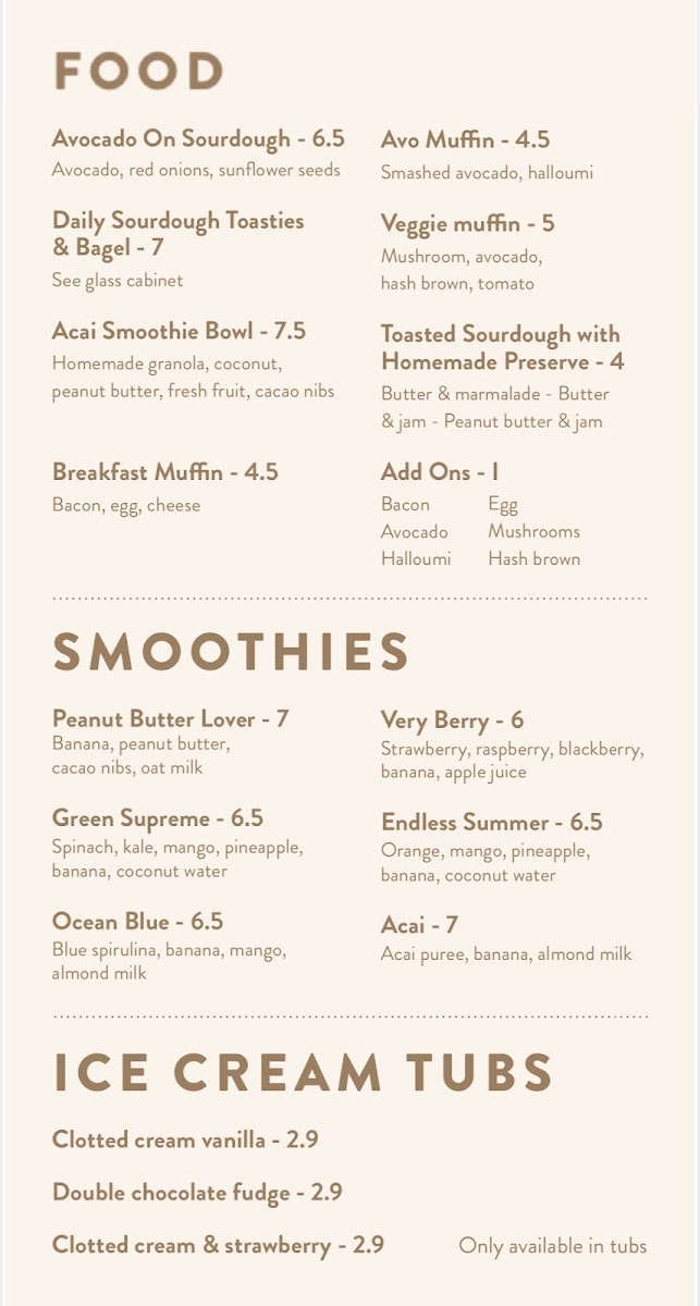 - Smoothies: A range of smoothies includes Peanut Butter Lover, Green Supreme, Ocean Blue, Very Berry, Endless Summer, and Acai options.