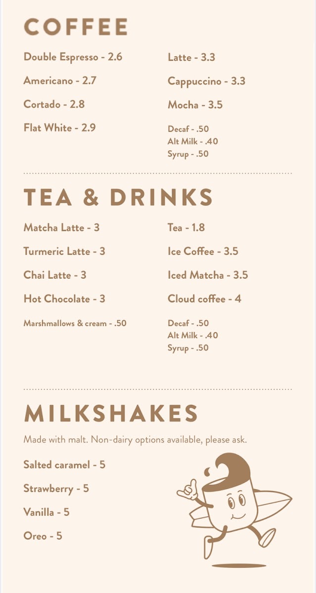 The menu offers a selection of beverages and light food options suitable for breakfast, coffee breaks, and casual dining. Visitors can choose from a variety of drinks including different types of milkshakes, smoothies, and coffee preparations.